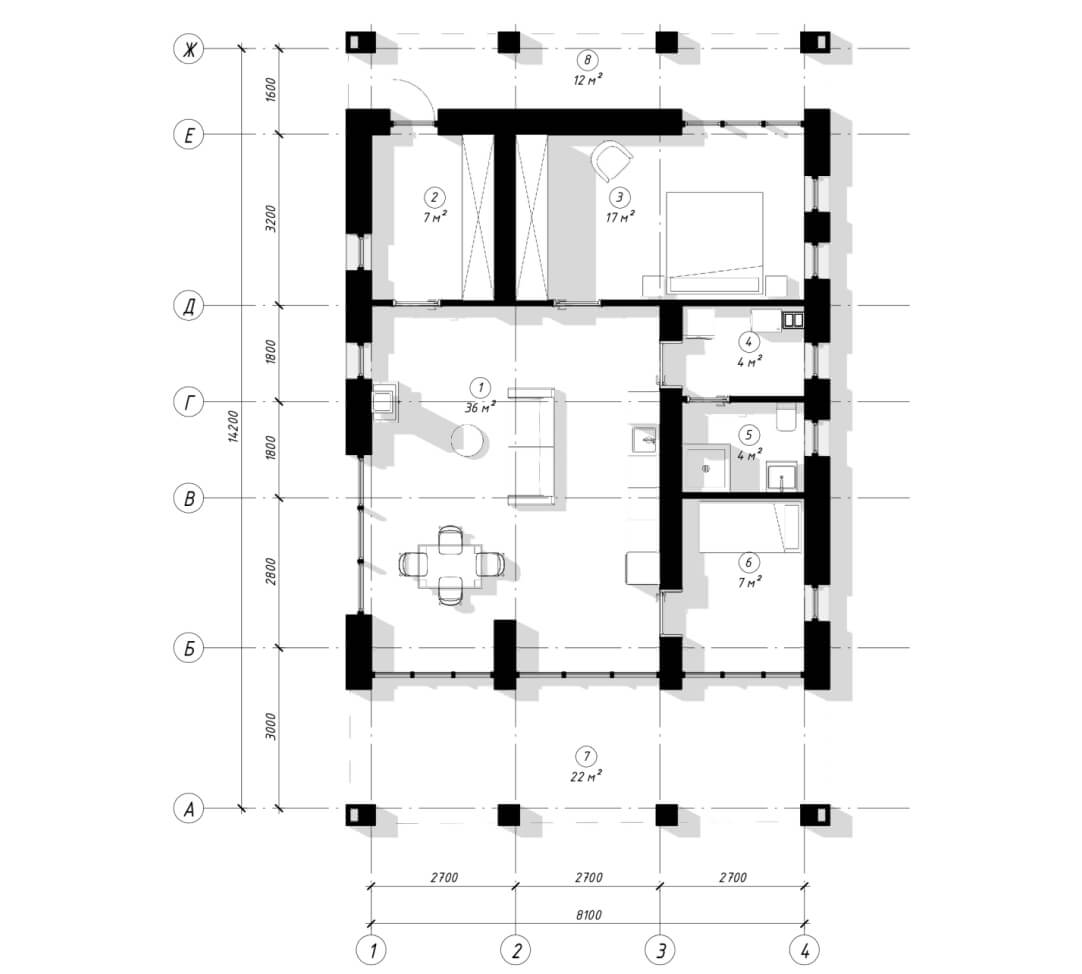 Проанализировав 136 проектов, мы определили, какие зоны члены семьи хотят видеть в своем доме чаще всего. Разместили все необходимое на комфортных 74 м² и не оставили лишних неиспользуемых площадей для отапливания и траты электричества.